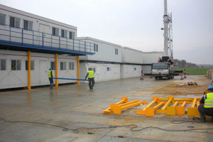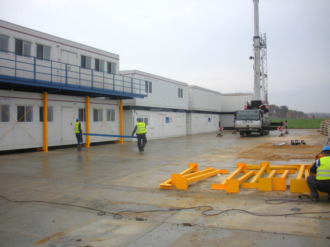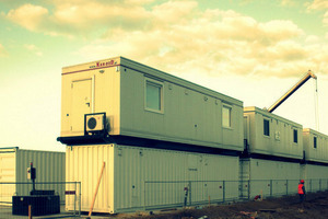 What constitutes for innovation is combining two kinds of structures i.e. bigger VIP wooden units on skids piled up on the Premium converted sea containers both with landings and staircases. Also, water and sewage installation service is an innovation element within this camp, i.e. two water and sewage service system tanks are set within one module. Assembly is on ground, thus it is not necessary to install tanks underground. Moreover, the camp is equipped with specialized technical units i.e. workshops, storage facilities equipped with chain operated cranes which is quite a unique element as far as container storage space is concerned. The fly camp is structurally, mechanically and electrically prepared for easy and rapid connection and erection. The entire facility is structurally supported on steel frame, which serves a permanent foundation for the facility. The modules were designed on the basis of regular sea containers maintaining their exterior dimensions with international heavy truck transport functionality. What minimizes limited surface problems at rig-sites is the fact that the units are stackable, they may be attached to other previously existing shacks as multiple storeys and are compatible with other cabins including skid types.